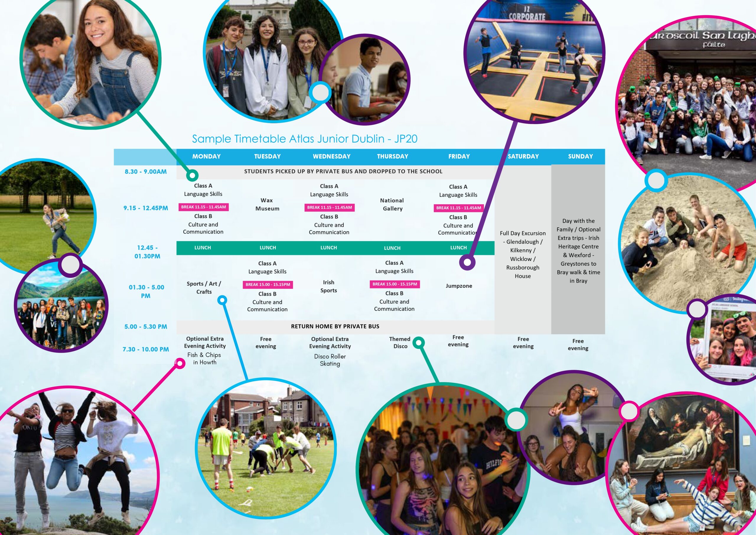 Sınıf içeriğinin ve aktivitelerinin her yaş grubu için uyarlanmasını sağlamak amacıyla Dublin’deki Junior Yaz Programında öğrenciler yaşa göre ayrılmaktadırlar. Zaman çizelgesi ise zig-zag formatında tasarlanmıştır. Yani bu, etkinliklerin bir kısmının sabahları, bir kısmının öğleden sonra gerçekleştiği anlamına gelir. Öğrenciler Atlas’ın özel otobüsleriyle okula getirilir ve gezilerinden sonra akşamları evlerine bırakılır. Başka bir deyişle, öğrencilerin okula gidip gelen öğrenciler için daha güvenli bir ortam yaratan toplu taşımayı kullanmaları gerekmez. Dublin’deki Atlas Junior Yaz Programı, genç öğrencilerin şehri görmesi ve Dublin’in sunduğu lezzetleri deneyimlemesi için harika bir yoldur!